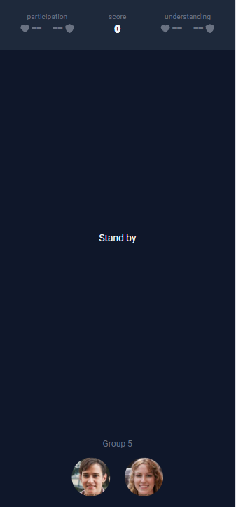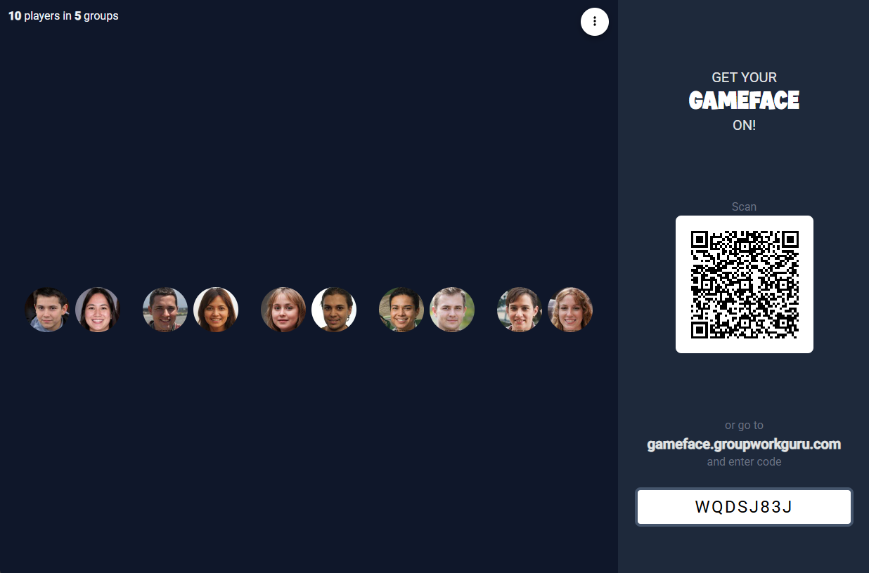 It is designed to be used in small-group classrooms, like tutorials, labs and workshops. At the beginning of class, you (or your tutor) displays Gameface on the main projector screen (Figure 1b). Students can scan the QR code shown there to access the player screen (Figure 1a) on their own devices. This screen allows students to view their scores, find groupmates, and participate in quizzes and tasks. You or your tutor can scan the same QR code to access the remote control (Figure 1c) for controlling the room and accessing sensitive information such as scores, choices, and private notes about the attendees.